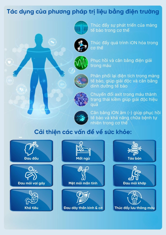 • Giảm đau: Máy trị liệu điện trường cao áp có thể giúp giảm đau do nhiều nguyên nhân khác nhau, bao gồm đau khớp, đau cơ và đau đầu.